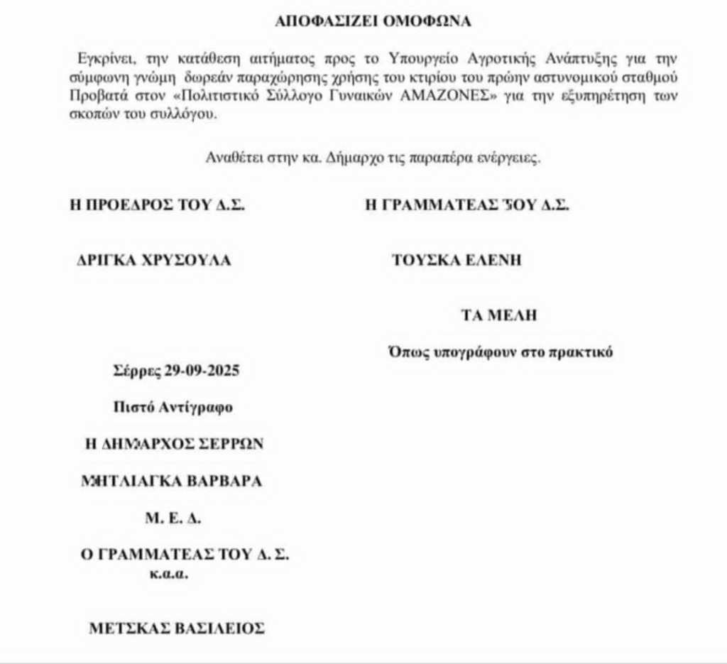 Μετά από συντονισμένες ενέργειες, με συνεχείς προσπάθειες και αγώνα, ο Σύλλογός μας κατάφερε να πετύχει κάτι σπουδαίο για το χωριό μας. Με τη στήριξη του Δήμου Σερρών, της κυρίας Μαγδαληνής Μπάρμπα και του Προέδρου της Τοπικής Κοινότητας Προβατά κυρίου Πάντσιου Κώστα, το οικόπεδο και το κτίριο της παλιάς αστυνομίας παραχωρήθηκαν στον Σύλλογό μας. Ο χώρος αυτός θα αξιοποιηθεί μεταξύ άλλων και ως έδρα του Συλλόγου μας, αλλά και για τη διοργάνωση πολιτιστικών εκδηλώσεων και δράσεων, που θα κρατούν ζωντανή την παράδοση και τον πολιτισμό του τόπου μας. Ευχαριστούμε θερμά όλους όσοι στάθηκαν δίπλα μας σε αυτή τη μεγάλη προσπάθεια. Το χωριό μας κερδίζει έναν χώρο πολιτισμού και δημιουργίας, που θα μείνει στις επόμενες γενιές.